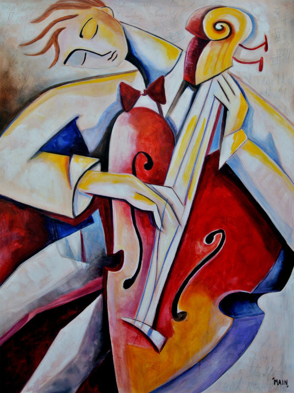 As he holds and plays the heart-shaped bass it symbolizes him vulnerably sharing his heart and letting it be known. Sometimes letting our true heart be know isn't the easiest thing to do, but in this painting he's bravely letting it all out and sharing the beauty of who he really is without holding anything back!